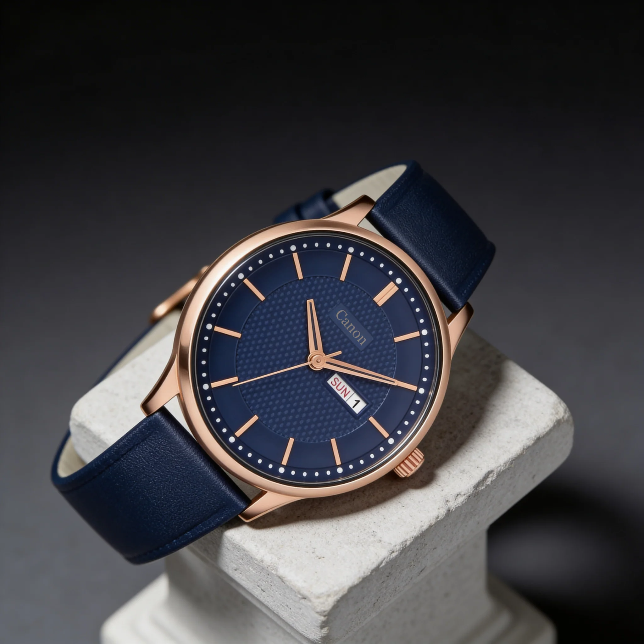 Bring sharp formal style to your daily wardrobe with CN-425. A blue dial rose gold watch for men designed around a rich, deep-blue textured dial that catches light with depth and dimension.