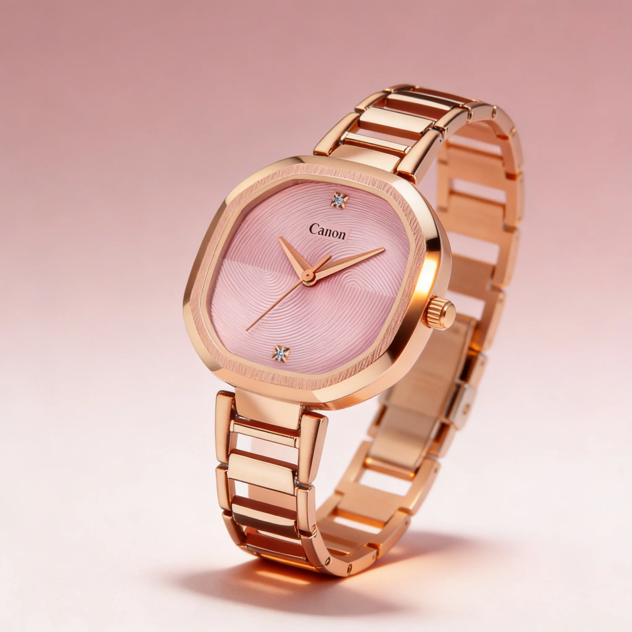 Elegance is in the details. The unique cushion shape frames a delicate pink dial, intricately textured to catch and reflect light beautifully. This monochromatic rose gold timepiece is a testament to understated design and quiet, confident charm.