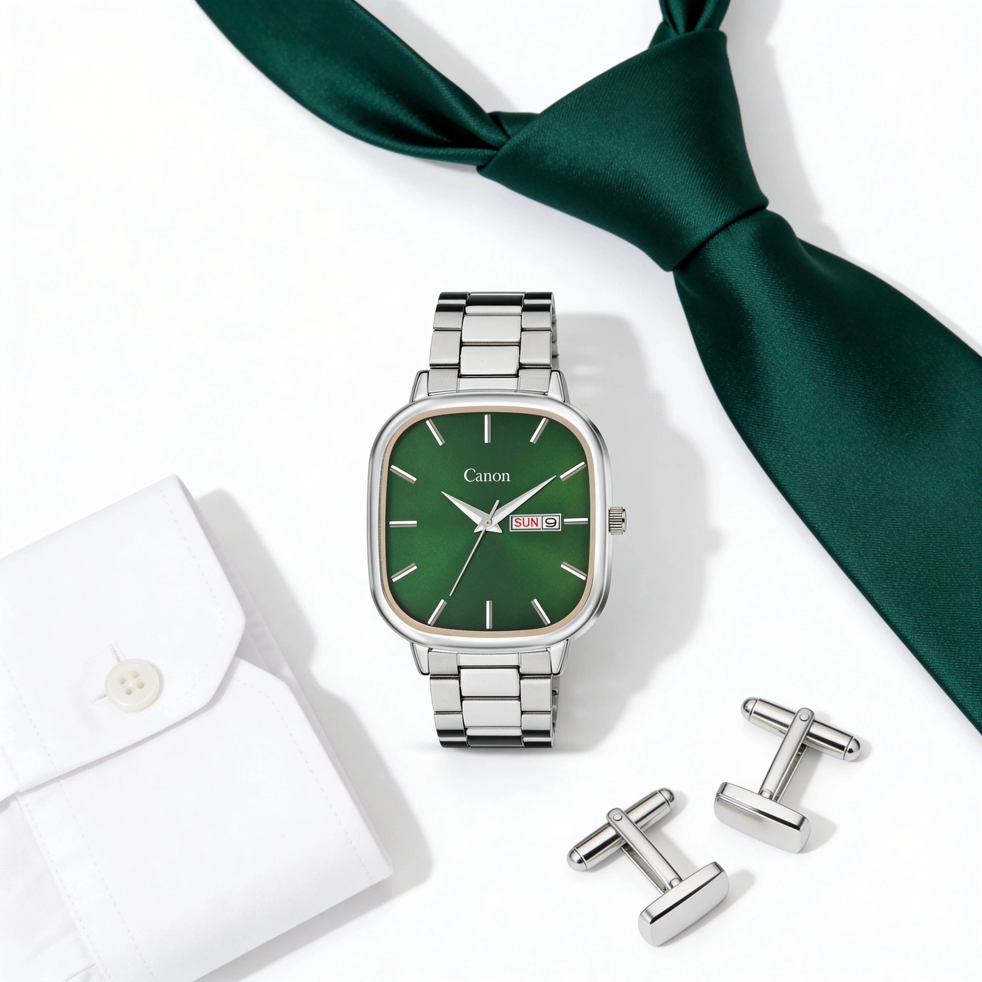 Elevate your daily ambition with the Lucid Royal Green Soft-Square Watch for Men from the Canon Quartz Lucid Collection. The deep forest green sunburst dial creates a rich, shifting play of light, giving this square dial watch a premium, statement look without being loud. Crafted in brushed stainless steel with a soft-square case, the watch delivers a modern geometric silhouette that feels sharp yet comfortable for all-day wear.