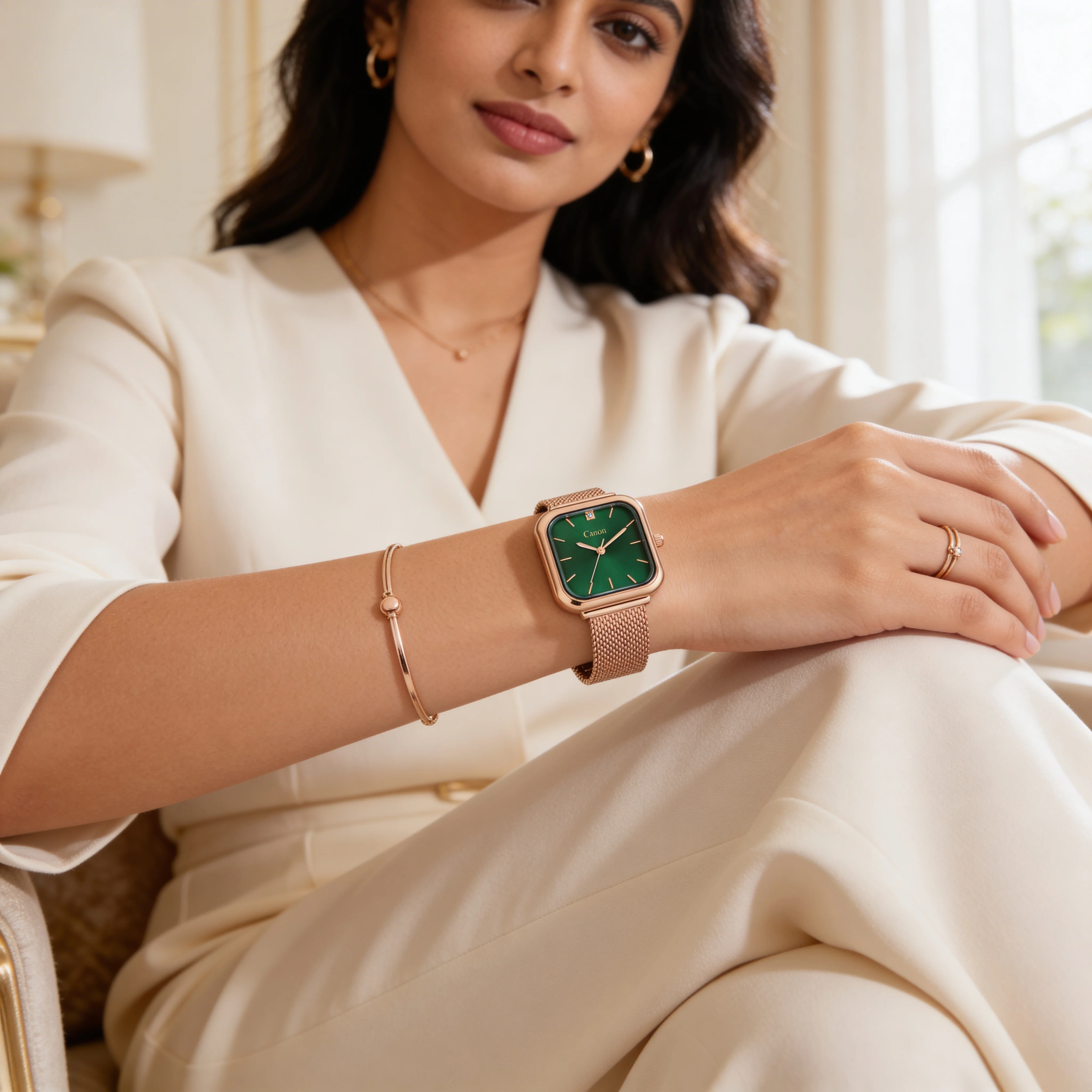 Designed to stand out without looking loud, this women’s green dial watch brings together timeless charm and contemporary polish. The square case gives it a distinctive vintage appeal, while the elegant colour combination makes it a versatile choice for office wear, dinner looks, festive outfits, and everyday dressing.